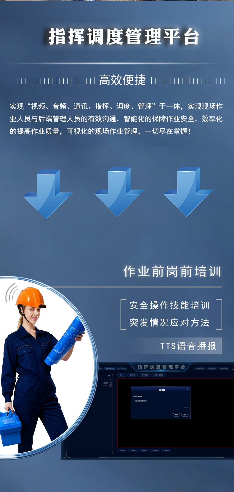 强大平台支撑:基于“网+云+端”架构的指挥调度平台,集视频、通讯、定位、管理于一体,支持灵活部署与远程运维,并提供配套移动APP。