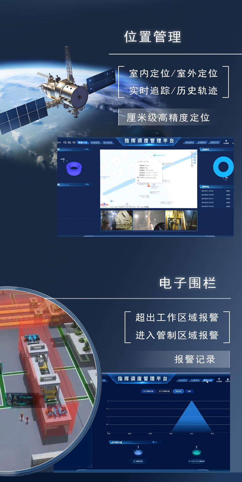 厘米级高精度定位:支持北斗三号RTK定位,实现室外厘米级精度;结合蓝牙与可选UWB,提供室内外无缝定位管理,人员位置精准可视。