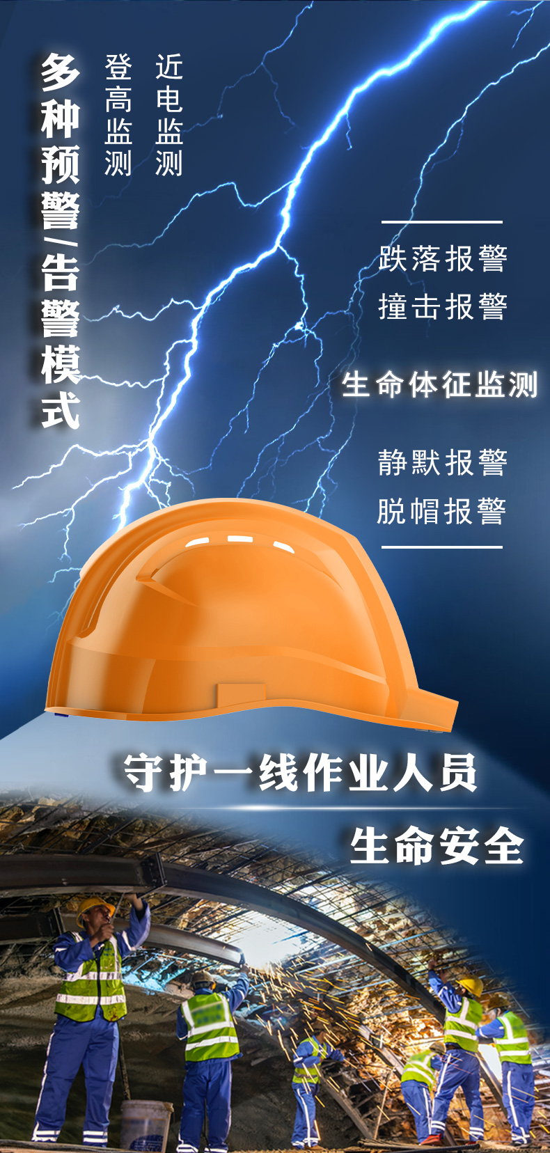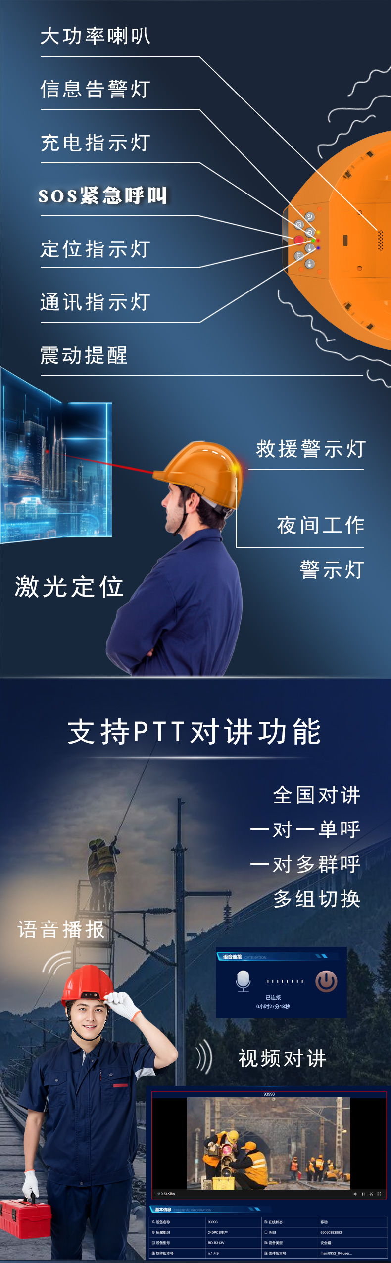 智能预警与主动监测:集成SOS、脱帽、跌倒、撞击、静默、电子围栏等多维度预警,并可选配气体检测与生命体征监测,通过前端声、光、震三重提示,主动防范风险。