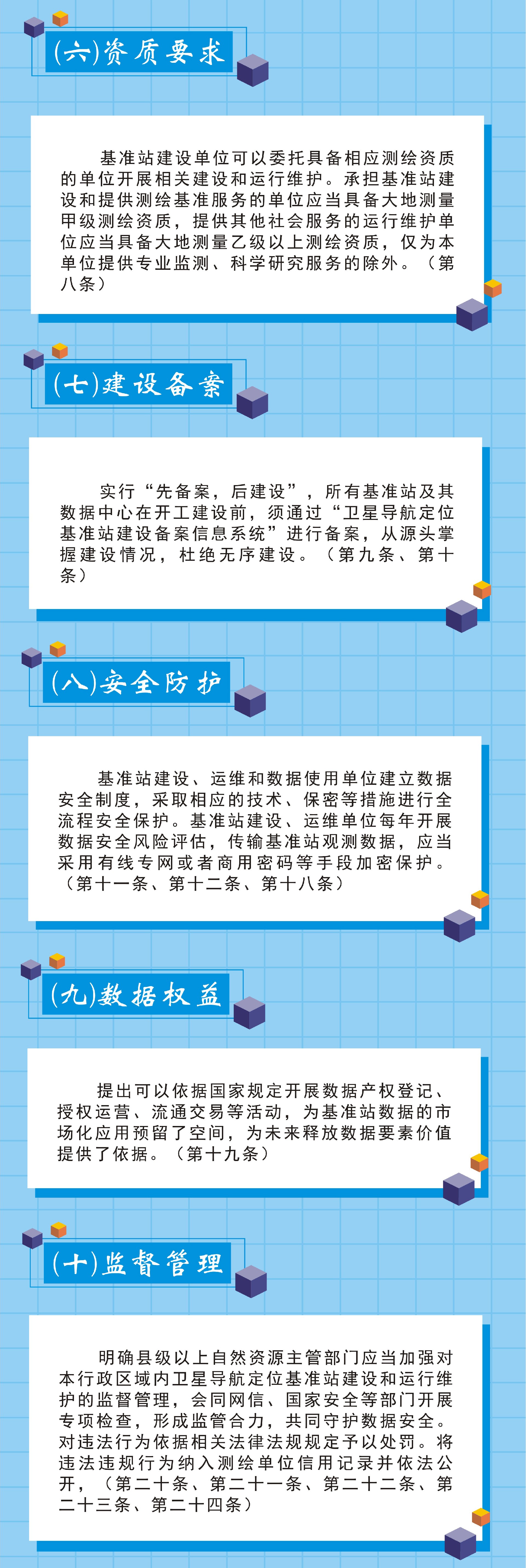 明确县级以上自然资源主管部门应当加强对本行政区域内卫星导航定位基准站建设和运行维护的监督管理。会同网信、国家安全等部门开展专项检查,形成监管合力,共同守护数据安全。对违法行为依据相关法律法规规定予以处罚。将违法违规行为纳入测绘单位信用记录并依法公开。(第二十条、第二十一条、第二十二条、第二十三条、第二十四条)